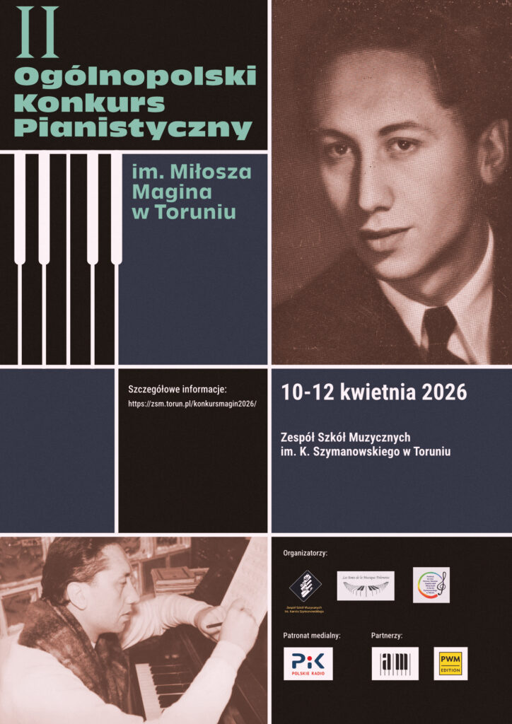 II Ogólnopolski Konkurs Pianistyczny im. Miłosza Magina w Toruni odbędzie się w dniach 10-12 kwietnia 2026 roku w Sali Koncertowej im Reginy Smendzianki Zespołu Szkół